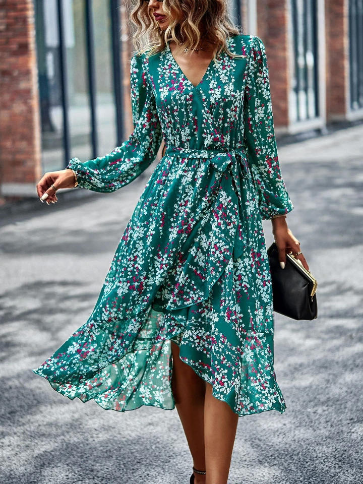 Virtue Forest Green Floral Print Ruffled Long Sleeve Dress Vestidos Especiais Looks Vestido Curto